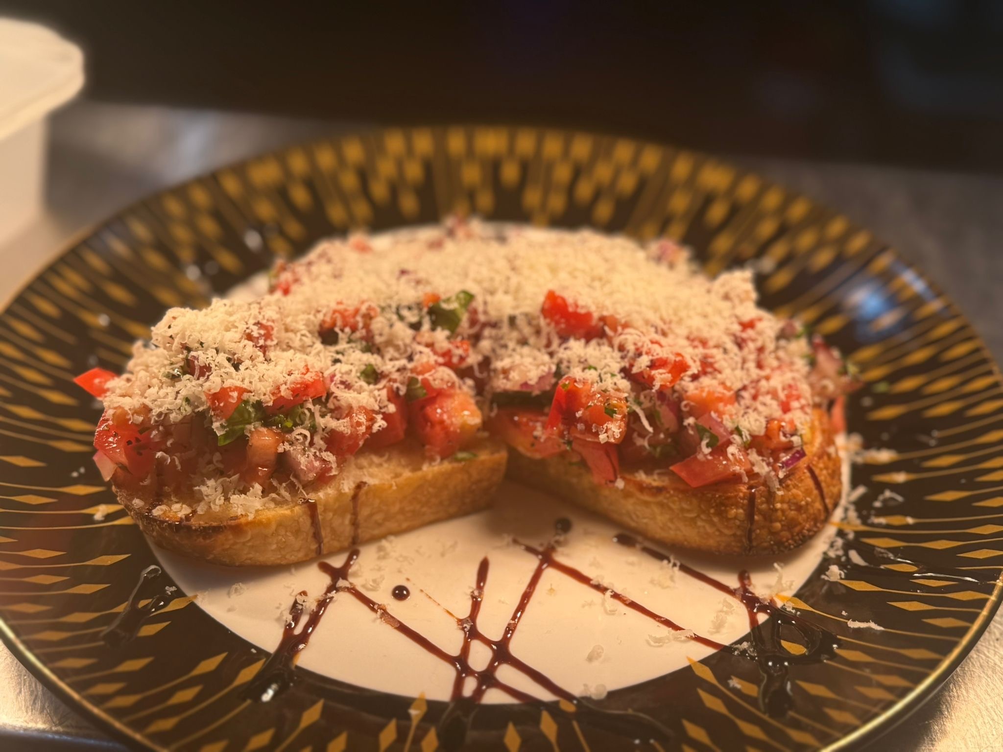 Roma tomato, basil, garlic, Spanish onion & extra virgin olive oil with touch of Italian glaze & shaved parmigiano Reggiano on white sourdough.
